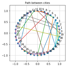 In this TSP implementation, for debugging purposes, every city remains in the perimeter of a unit circle maintaining the same distance between the adjacent cities, because of this property we know the shortest path through all the cities will be at most 2π (perimeter of unit circle) allowing us to check the validity of our algorithm regardless the amount of cities.